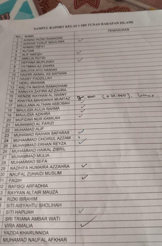 Seperti di sekolah Tunas Harapan Islam Tenjo yang memberatkan orangtua murid dengan adanya pembayaran sampul rapot dari SD- SMP Dengan kisaran biaya 80-100rb/siswa juga dengan bukti dari grup Wa yang difasilitasi untuk komunikasi dengan orang tua murid.
