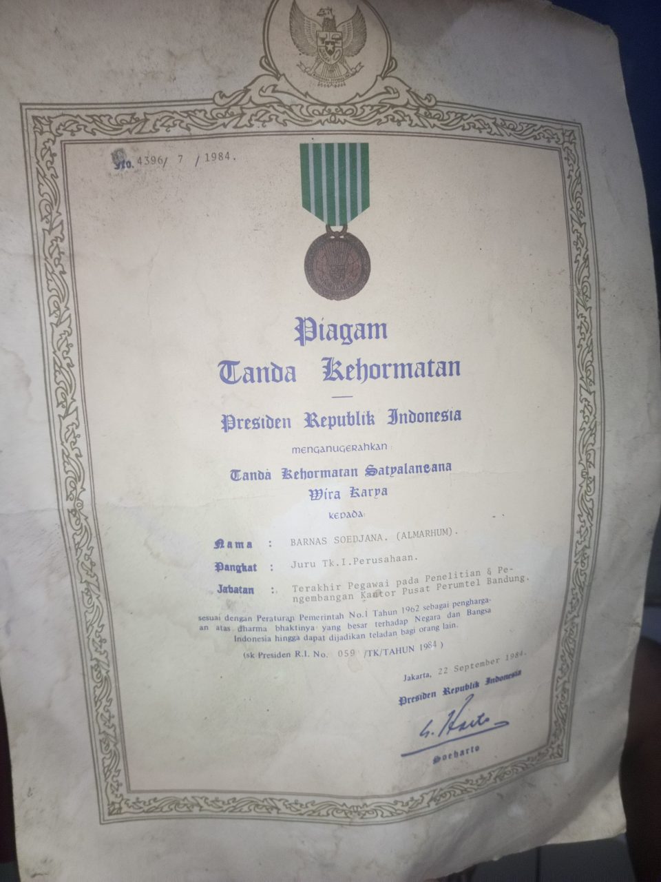 Piagam kehormatan tersebut sekarang di pegang oleh anaknya yang aktif sebagai jurnalis , Atep ( Nama penggilan keluarga ) .