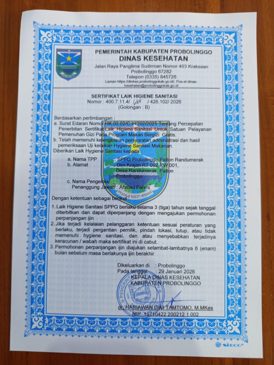 Pengelola menegaskan bahwa operasional dapur telah memenuhi standar sanitasi sebagaimana dibuktikan dengan terbitnya Sertifikat Laik Higiene Sanitasi (SLHS) dari instansi terkait.