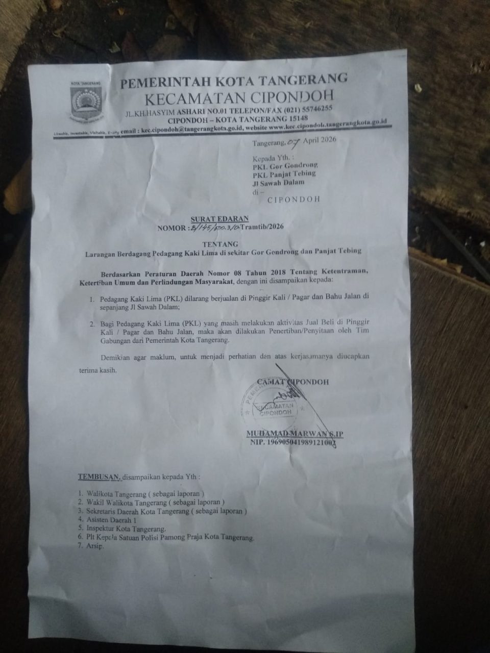 Camat Cipondoh, Muhamad Marwan S. IP, menerbitkan Surat Edaran bernomor B/145/500.3/0 Tramtib/2026 tentang larangan berdagang bagi Pedagang Kaki Lima (PKL) di sekitar GOR Gondrong dan kawasan Panjat Tebing.